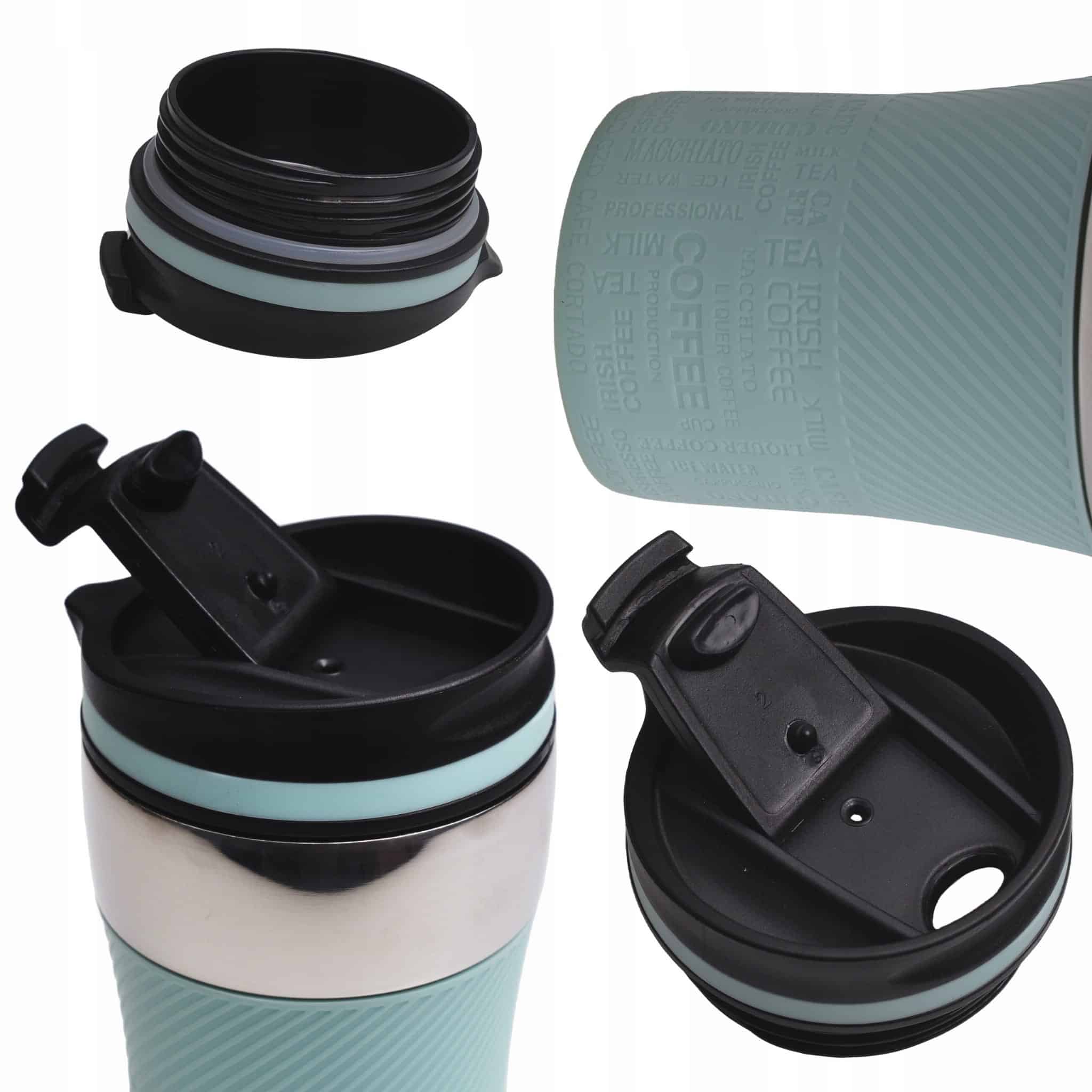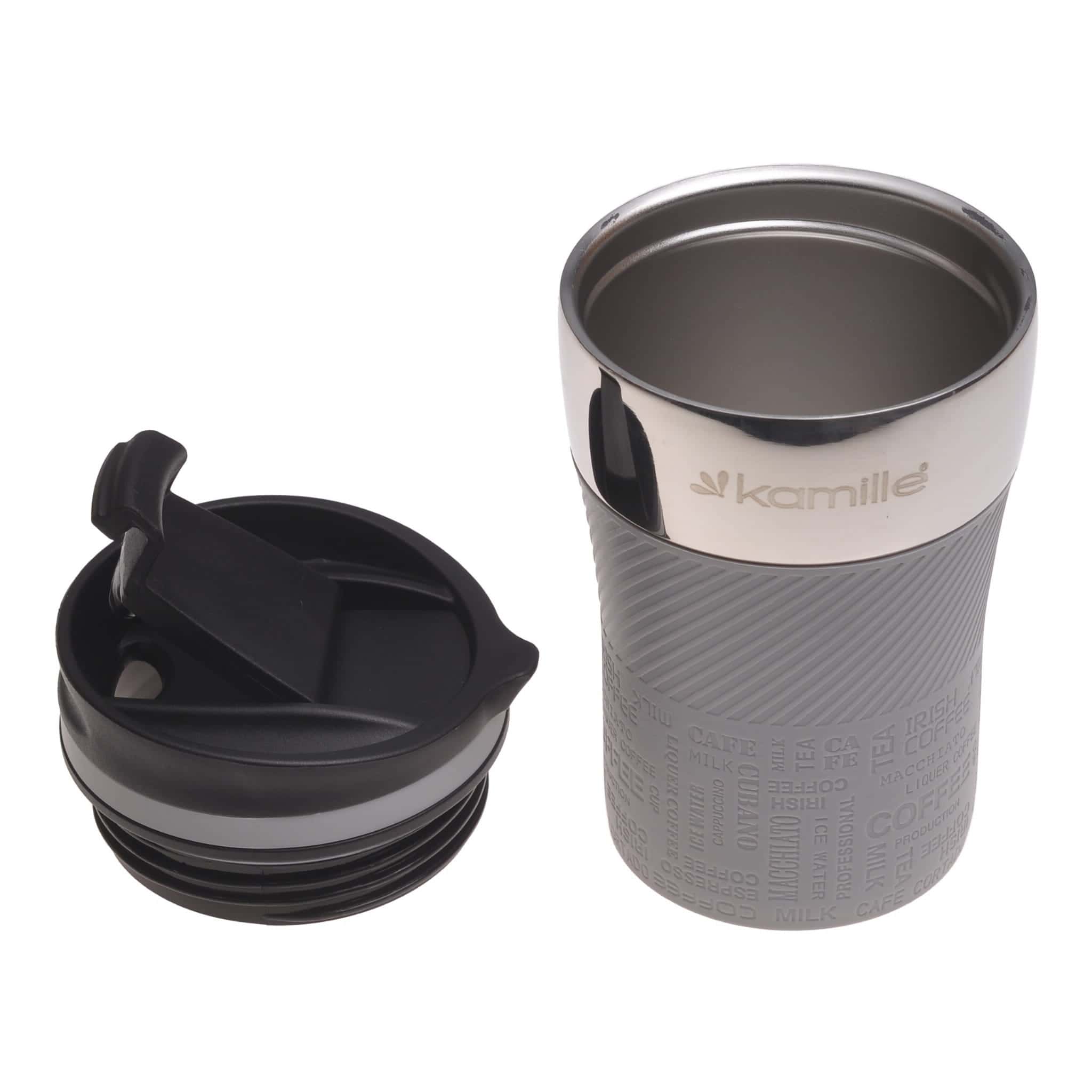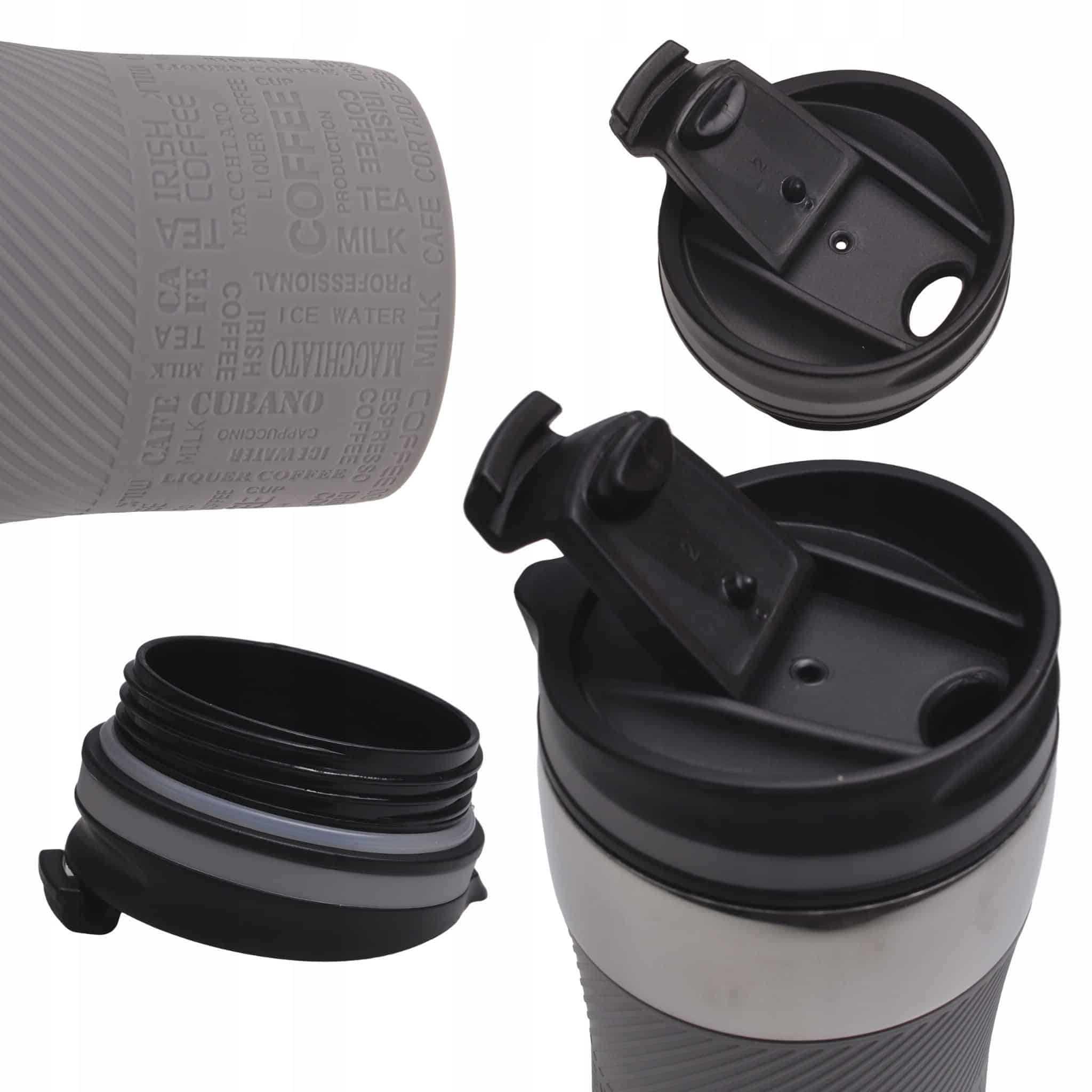 Baza canii este prevazuta cu un strat antiderapant, asigurand stabilitate pe birou sau in masina. Capacul etans previne scurgerile accidentale. Culoarea gri confera un aspect modern si discret.
