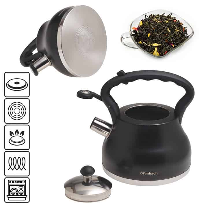 Ceainicul Ofenbach NB-100313BL este construit pentru uz zilnic. Are un design modern și elegant. Finisajul negru se potrivește în orice bucătărie contemporană. Corpul este din oțel inoxidabil durabil. Capacitatea este de 2,7 litri. Poți pregăti apă pentru ceai sau cafea pentru întreaga familie. Fluierul semnalizează clar când apa începe să fiarbă. Mânerul fix are strat soft‑touch. Mânerul rămâne rece în condiții normale de utilizare. Butonul de pe mâner permite deschiderea rapidă a gurii de scurgere. Fundul este gros și distribuie căldura uniform. Este compatibil cu plite pe gaz, electrice, vitroceramice și cu inducție. Forma și mărimea îl fac ușor de folosit și de depozitat. Curățarea este simplă și rapidă. Materialele rezistă la uzură și zgârieturi moderate. Designul păstrează aspectul estetic chiar și după utilizări repetate. Siguranța este integrată prin fluier și prin mânerul ergonomic. Evitarea opăririlor este mai ușoară datorită construcției funcționale. Ceainicul se folosește direct pe aragaz. Poate fi folosit pentru preparate care necesită apă fierbinte. Ambalajul este pregătit pentru vânzare și pentru oferit cadou. Recomandat pentru familii, gazde și birouri mici. Specificații practice: capacitate 2,7 L; material corp: oțel inoxidabil; culoare: negru; mâner: nylon cu acoperire soft‑touch; fluier prezent; compatibil pentru inducție. Dimensiuni aproximative: diametru fund ~20 cm, înălțime cu mâner ~24 cm. Instrucțiunile simple de utilizare și îngrijire fac produsul potrivit pentru orice gospodărie. Alege acest ceainic pentru fiabilitate, design și compatibilitate cu toate tipurile de plite.