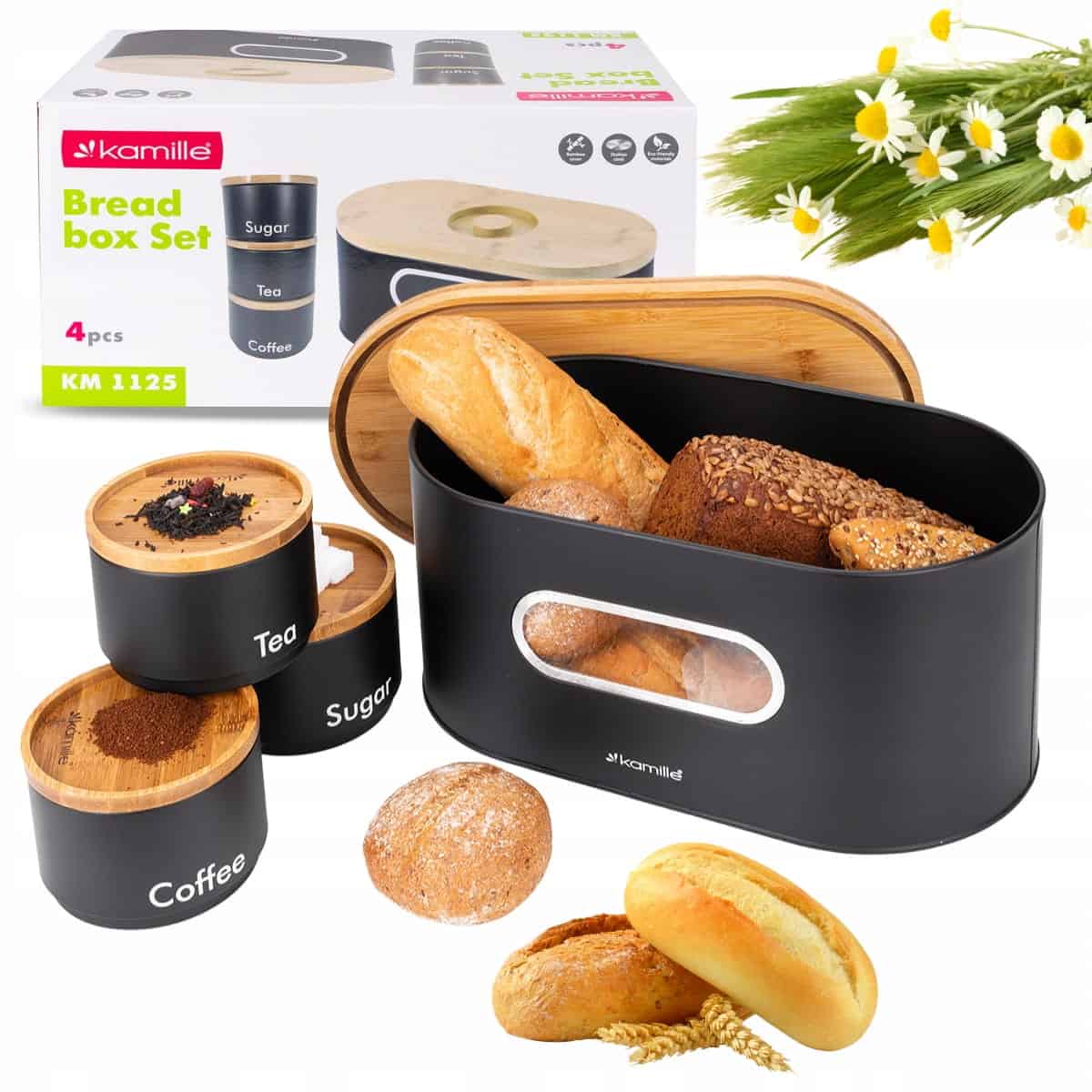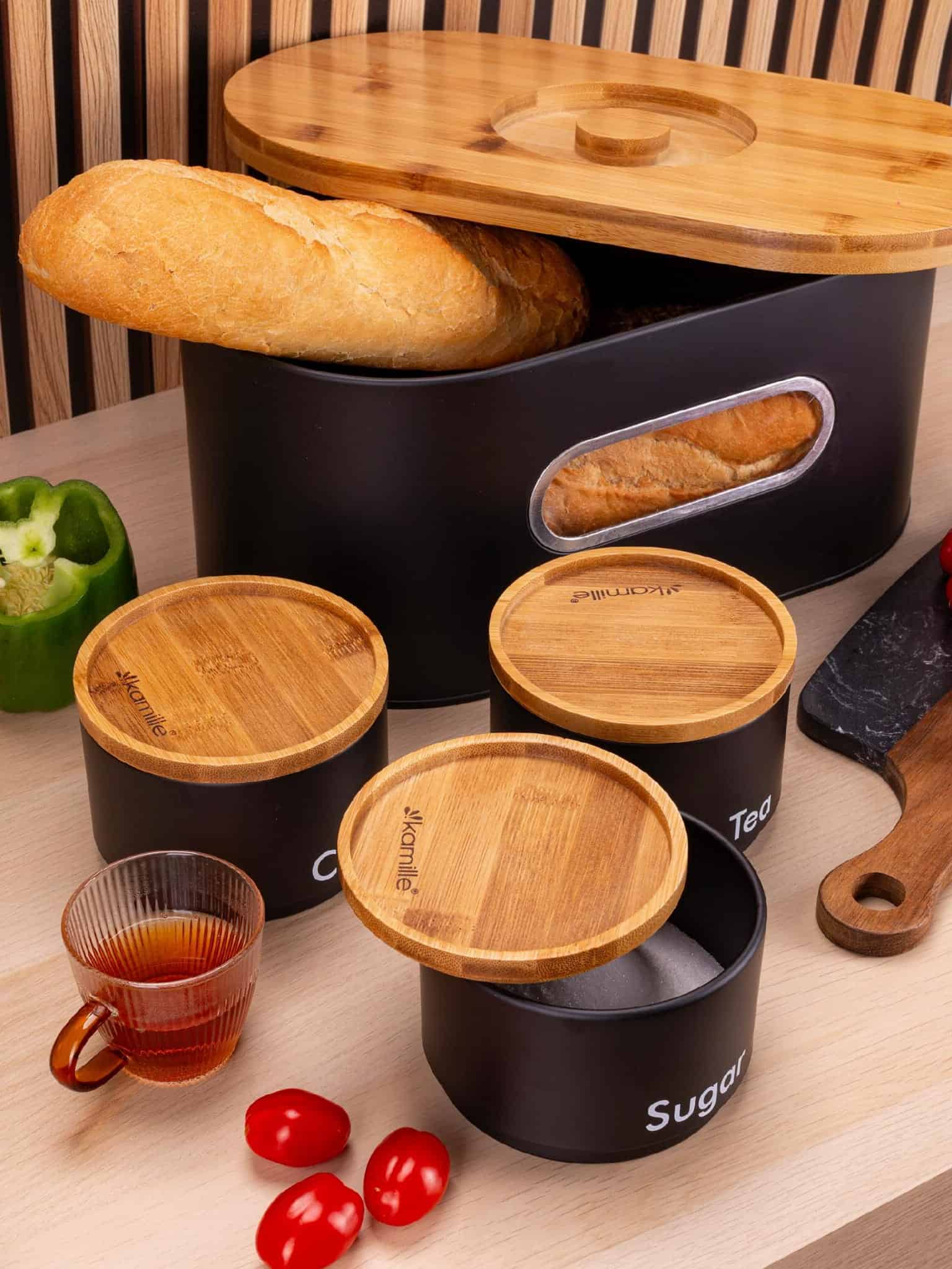 Recipientele metalice au capace etanse, protejand aromele. Este o Cutie paine 3 recipiente bambus metal un set functional si cu un design modern, care imbina materialele naturale cu cele durabile.