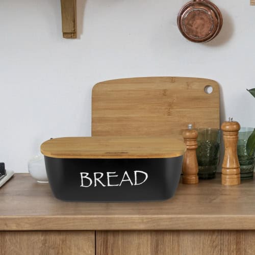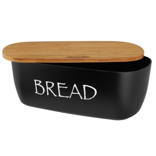 Cutie eleganta pentru paine, cu dimensiuni de 36×20.5×13.5 cm, realizata din metal negru mat si capac din bambus natural. Capacul poate fi utilizat si ca tocator pentru paine. O Cutie paine bambus neagra 36cm care pastreaza produsele de panificatie proaspete si adauga un aspect modern bucatariei.