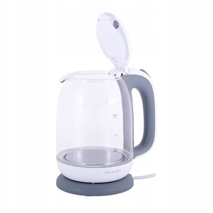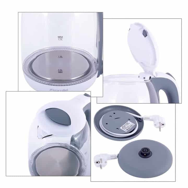 Acest fierbător Kamille oferă un volum de 1,7 litri, ideal pentru a fierbe apă pentru mai multe cești de ceai, cafea sau supă rapid. Carcasa combină sticla termorezistentă cu detalii din inox, oferind un aspect modern și un interior sigur pentru lichidele fierbinți.