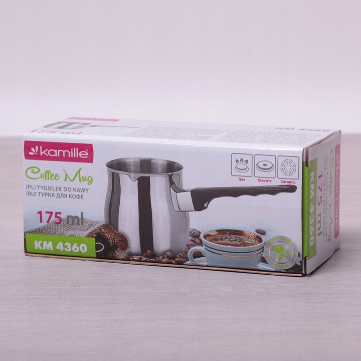Designul compact și capacitatea de 175 ml îl fac potrivit pentru prepararea unei porții individuale de cafea turcească. Mânerul ergonomic permite o prindere confortabilă și sigură, astfel încât turnarea cafelei în ceașcă este ușoară și precisă, fără stropi sau vărsări nedorite.