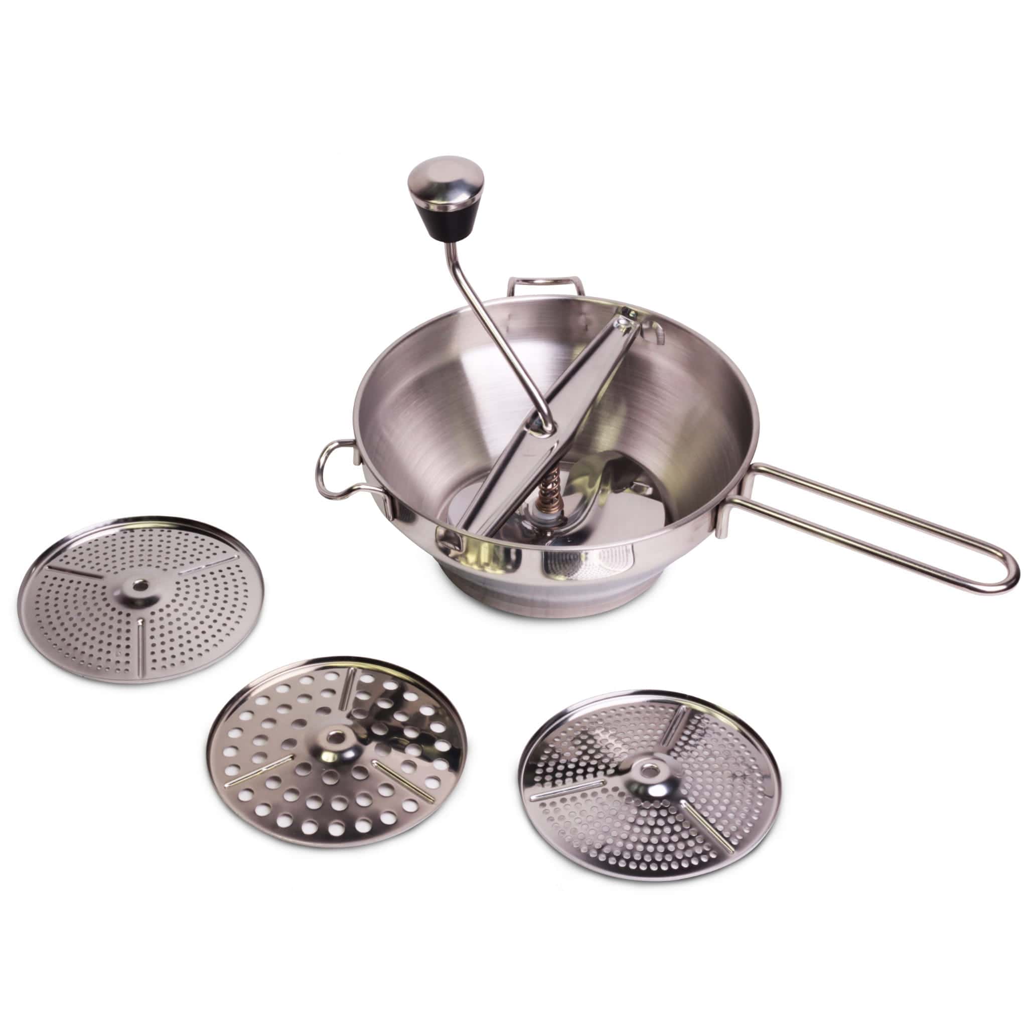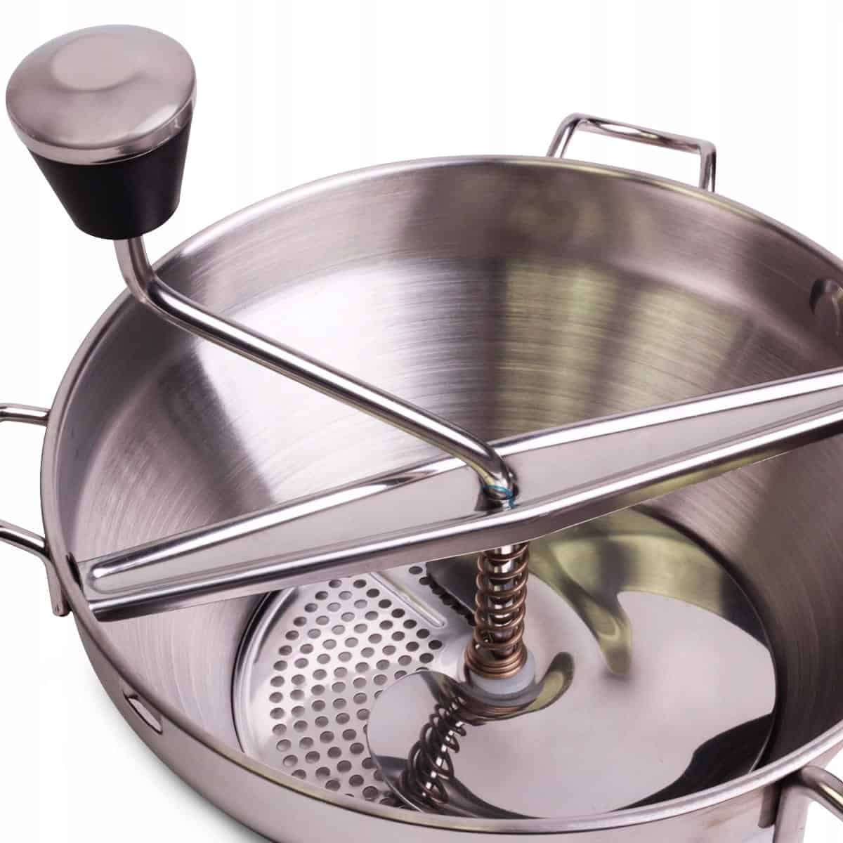 Construita integral din otel inoxidabil de inalta calitate, masina de pasat este durabila, igienica si rezistenta la acizii din alimente. Setul include 3 discuri/site interschimbabile, oferind granulatii diferite (fina, medie, grosiera) pentru a se potrivi oricarei retete. Designul cu maner lung si manivela asigura o utilizare confortabila si stabila pe oala sau castron.