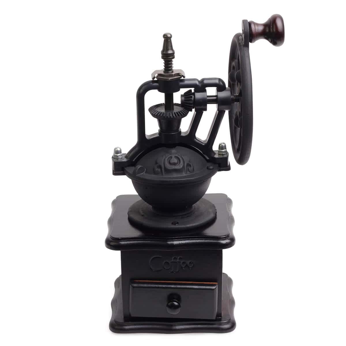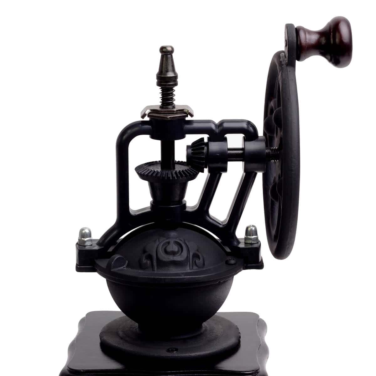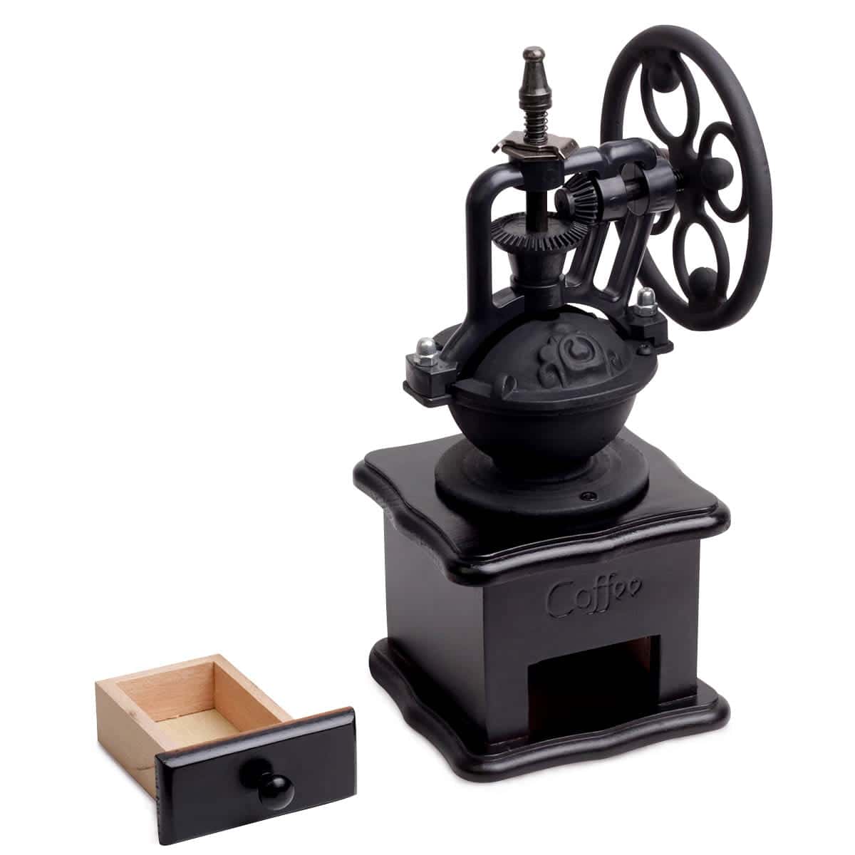 Masina de tocat manuala (Rasnita) cu design retro/vintage. Mecanism de macinare ceramic, reglabil. Corp din lemn (culoare multicolor, presupus). Cu sertar pentru colectare.