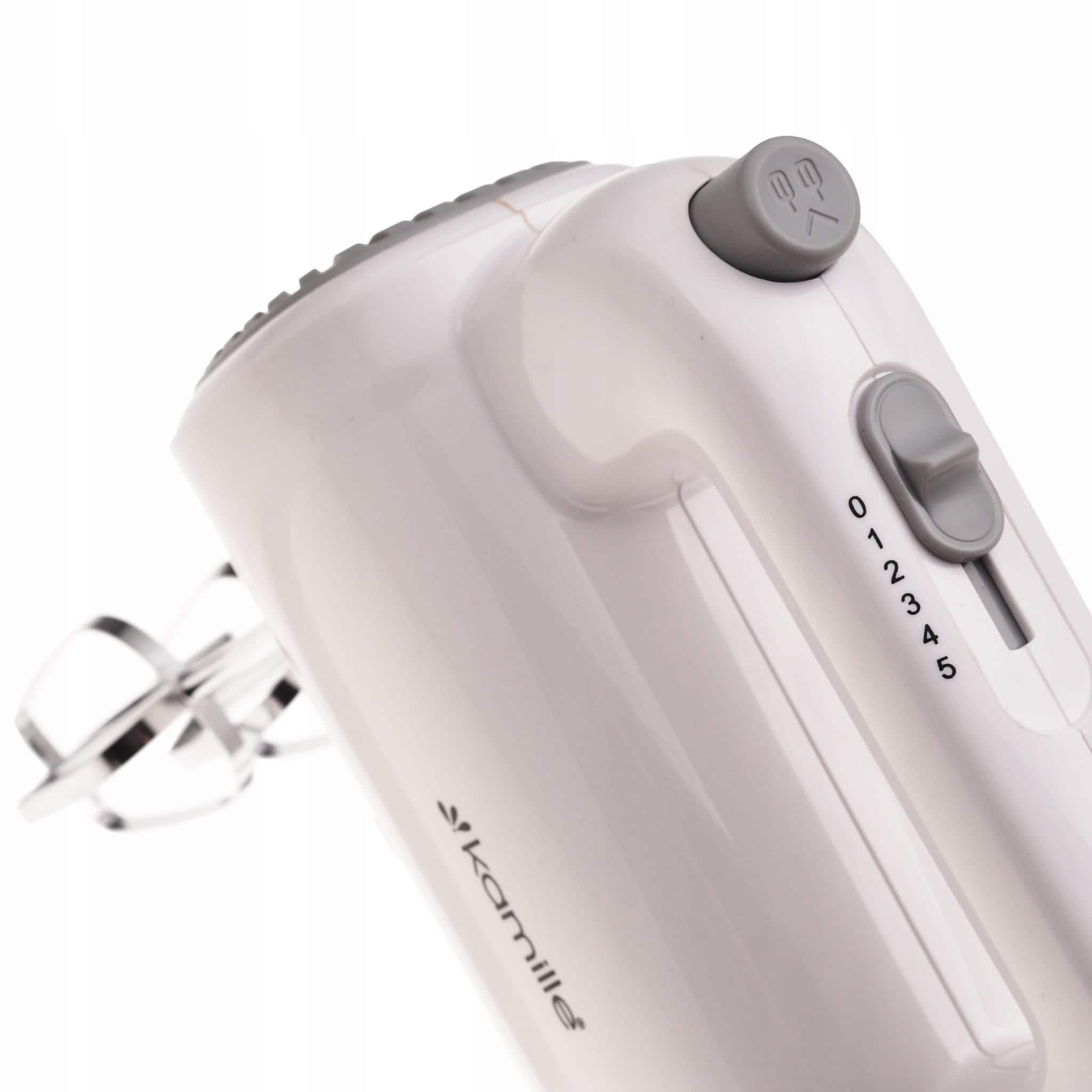 Dispune de 5 trepte de viteza (plus functie turbo, presupusa), permitand ajustarea intensitatii in functie de preparat. Setul include doua tipuri de accesorii (teluri si carlige pentru aluat), ambele din otel inoxidabil (inox). Functia Eject permite eliberarea rapida si igienica a accesoriilor prin simpla apasare a unui buton. Corpul mixerului este din plastic rezistent.