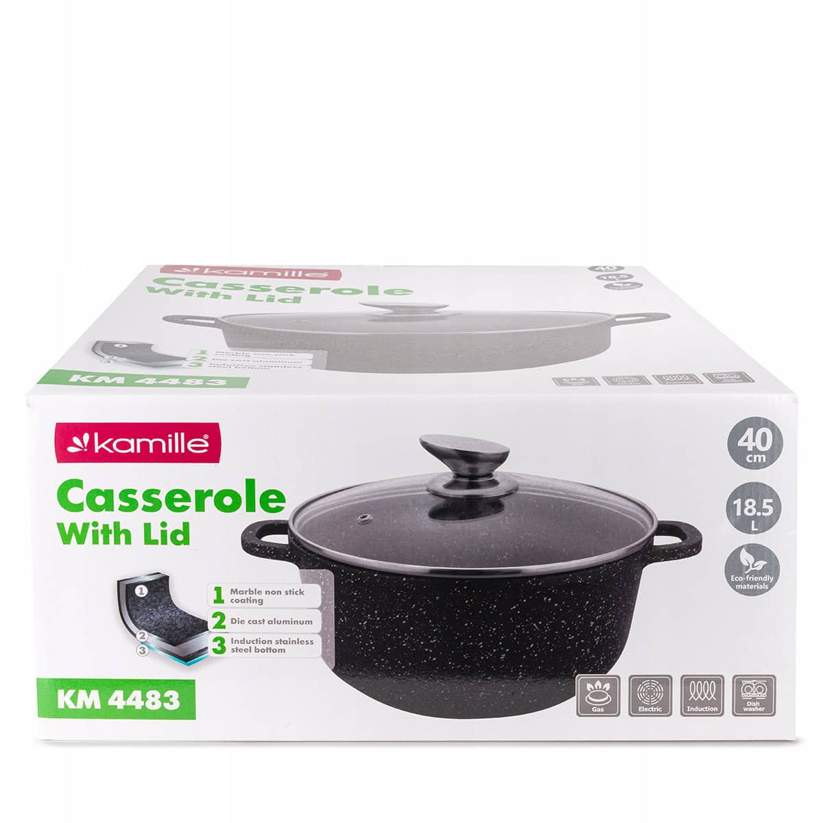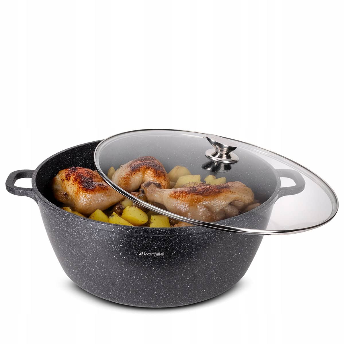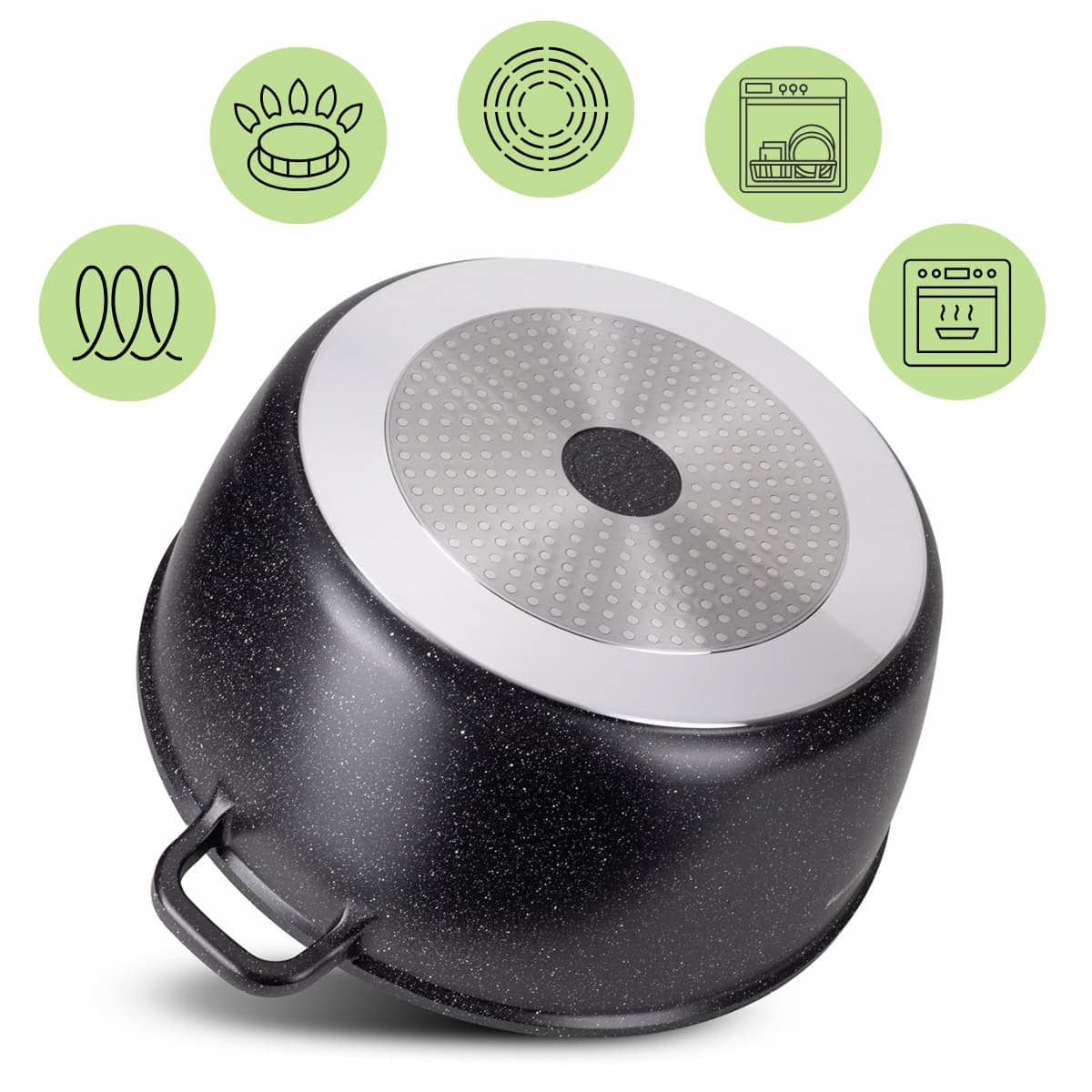 Corpul robust din aluminiu turnat asigura o incalzire rapida si uniforma, in timp ce invelisul marmorat (granit) antiaderent ofera durabilitate si previne lipirea alimentelor. Oala vine cu un capac din sticla termorezistenta cu maner si orificiu de abur. Fundul este special proiectat pentru a fi compatibil cu toate sursele de caldura, inclusiv plitele cu inductie.