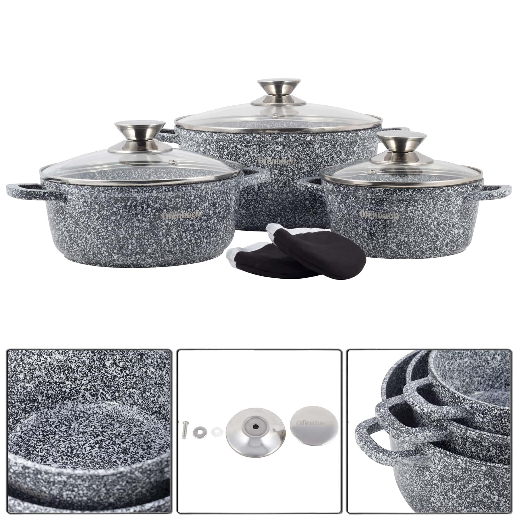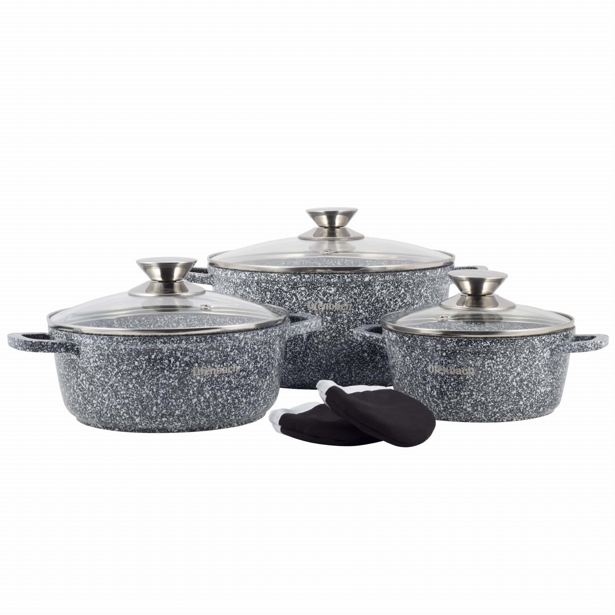 Invelisul de granit ofera o durabilitate superioara. Oalele sunt dotate cu capace de sticla. Este un Set 3 oale granit rezistent zgarieturi care se va integra perfect in bucataria dumneavoastra moderna.