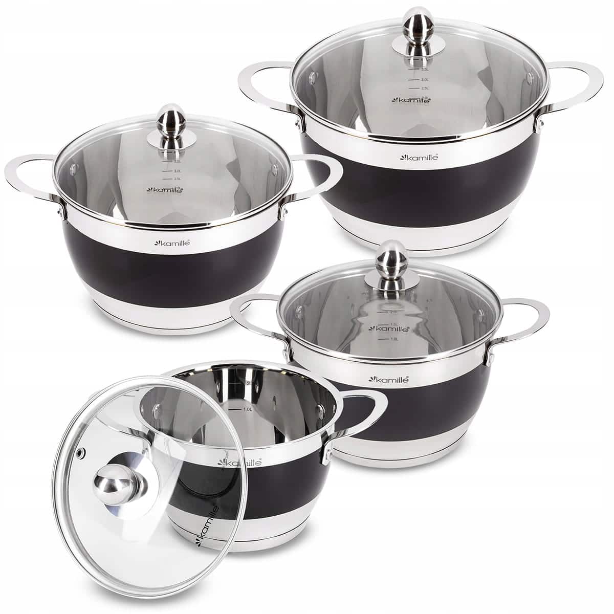 Set de 4 oale cu 4 capace (8 piese in total), din otel inoxidabil premium. Oalele au capacitati mari, variind de la 2.0 Litri pana la 9.0 Litri. Un Set 8 piese oale inox 2L 9L inductie cu fund incapsulat, care asigura o excelenta distributie a caldurii si este compatibil cu plitele pe inductie si toate celelalte surse de caldura.