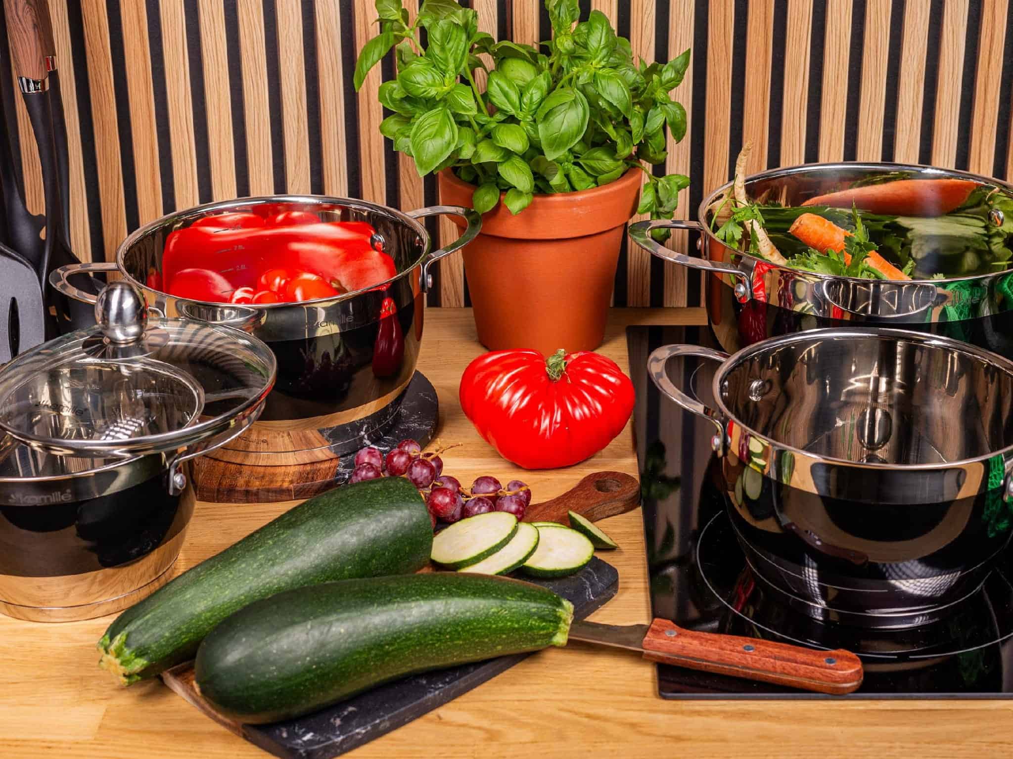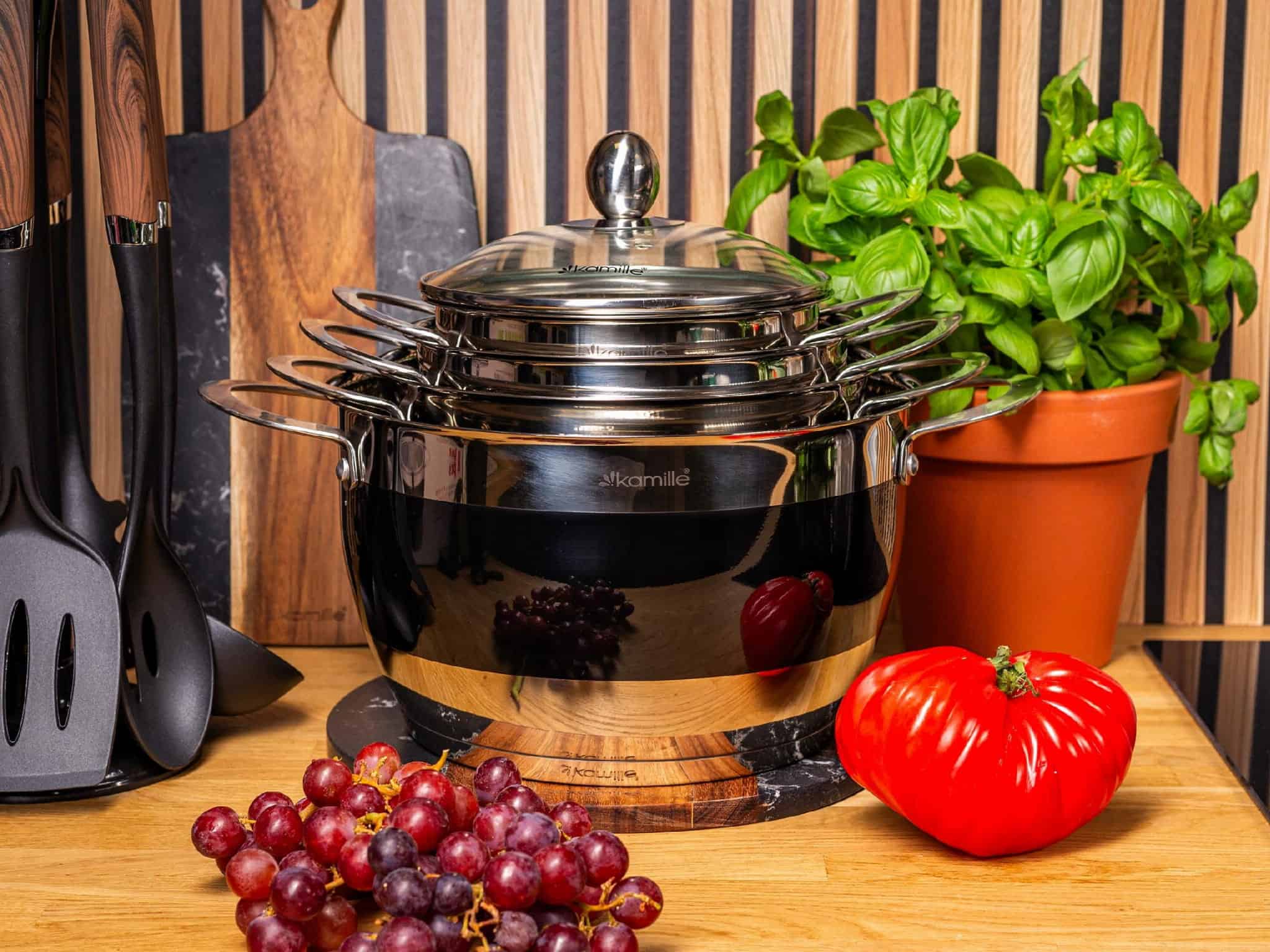 Acest set este ideal pentru familiile numeroase sau pentru cei care gatesc frecvent in cantitati mari, avand si o oala foarte incapatoare de 9 Litri.