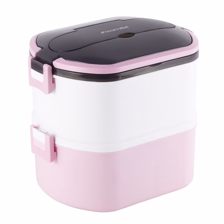 Set Kamille 5 cutii alimentare, 1500 ml, alb‑roz, cu capace etanșe – ideal pentru organizarea meselor și transport sigur.