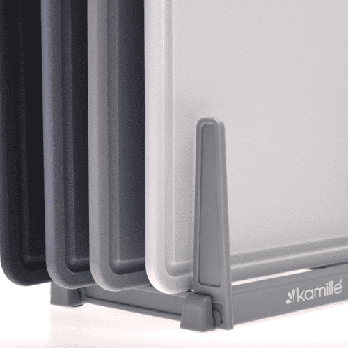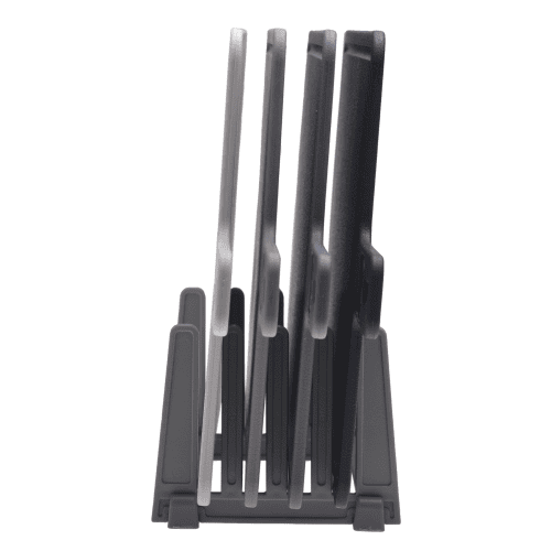 Suportul inclus permite depozitarea verticala, economisind spatiu pe blat si asigurand uscarea rapida a tocatoarelor dupa spalare. Materialul este rezistent si nu toceste lamele cutitelor.