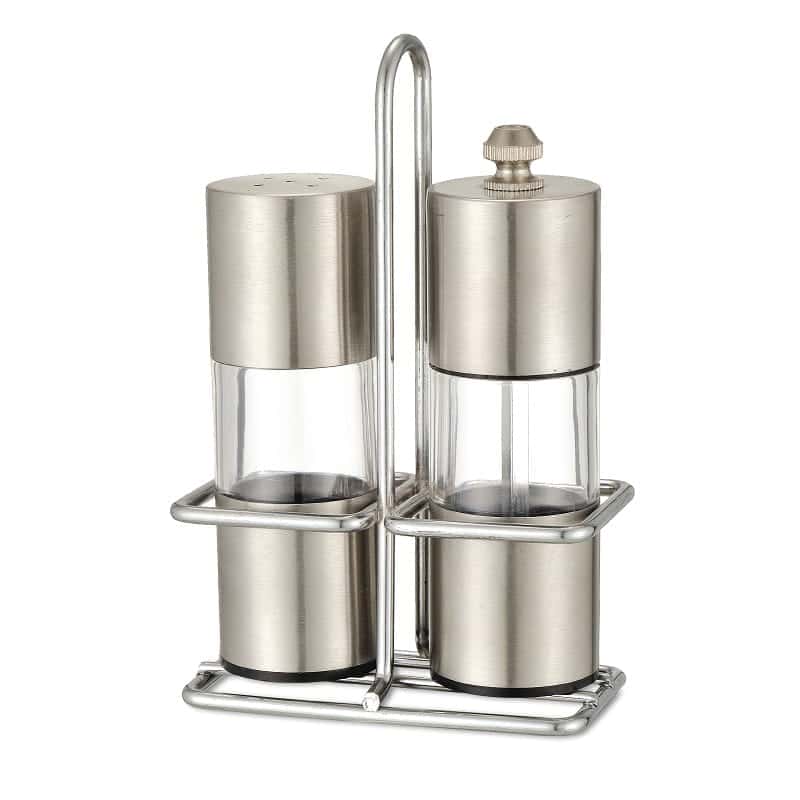 Acest set elegant este format dintr-o rasnita manuala pentru piper si o solnita clasica, fiind accesoriile perfecte pentru orice masa de dining. Designul hibrid din sticla si otel inoxidabil le confera un aspect profesional si modern.