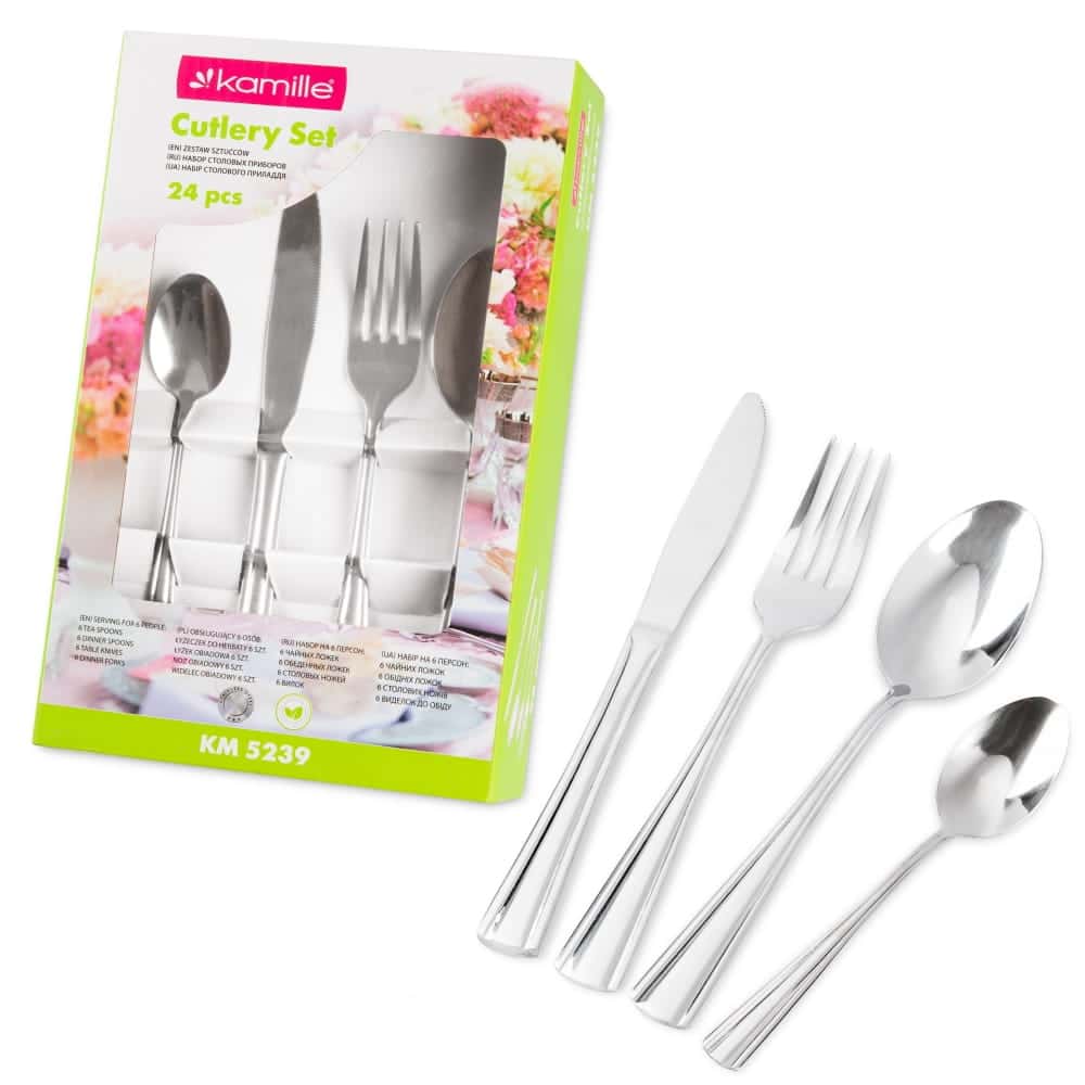 Tacamurile sunt realizate din otel inoxidabil de inalta calitate, asigurand durabilitate si rezistenta la rugina. Finisajul lucios confera un aspect modern si rafinat. Setul include 6 x cutite, 6 x furculite, 6 x linguri de masa si 6 x lingurite de ceai.