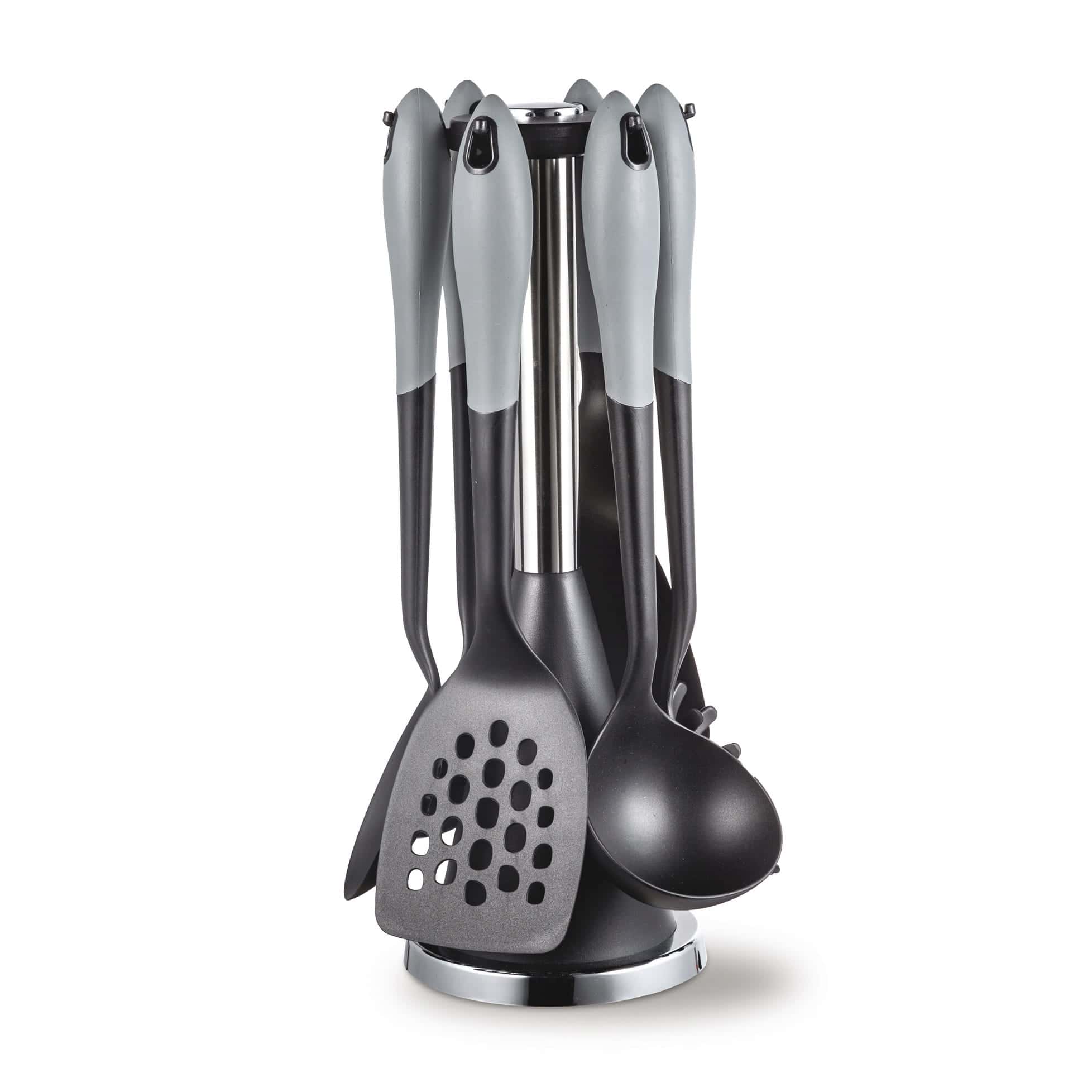 Manerele din otel inoxidabil ofera o priza confortabila si un aspect elegant. Suportul rotativ din plastic asigura ca ustensilele sunt mereu la indemana. Este un Set ustensile bucatarie 7 elemente suport ce combina ergonomia cu durabilitatea.