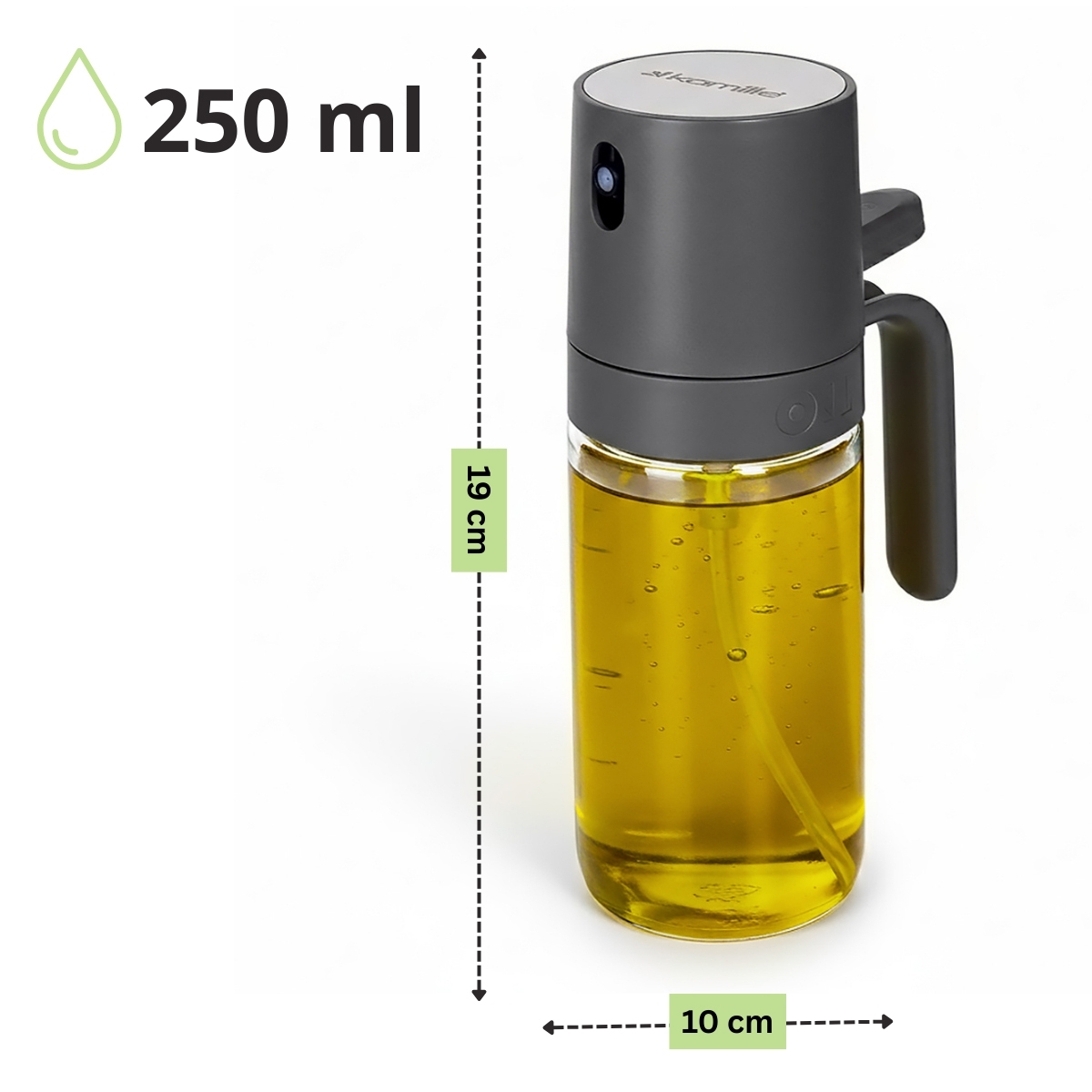 Recipientul este realizat din sticlă rezistentă și durabilă. Sticla este un material sigur pentru contactul cu alimentele și nu influențează gustul uleiului. Datorită designului transparent, poți vedea cu ușurință cantitatea de lichid rămasă în recipient. Acest lucru îți permite să reumpli spray-ul atunci când este necesar.