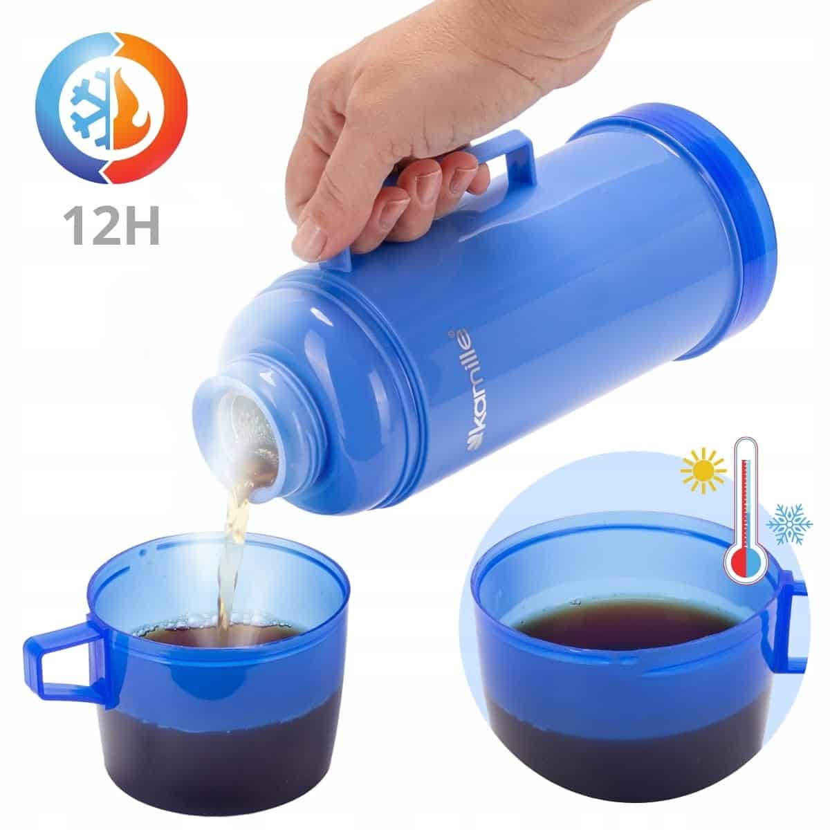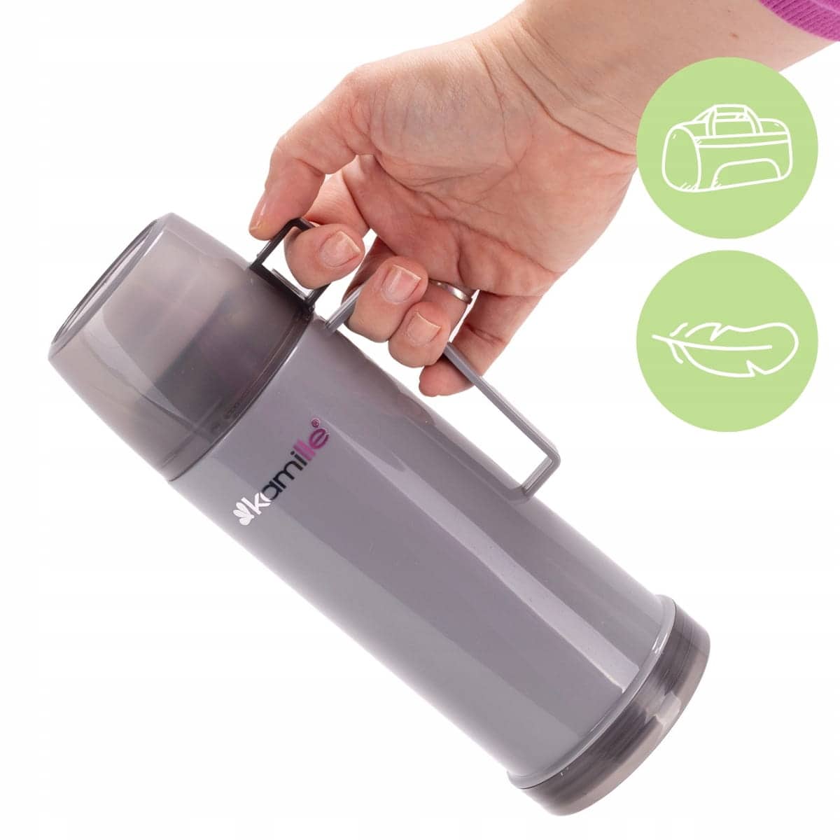 Caracteristica principala este capacul exterior, care functioneaza ca o cana de baut, eliminand nevoia de a transporta recipiente suplimentare. Inchiderea este etansa, iar corpul combina inoxul durabil cu elemente din plastic rezistent.