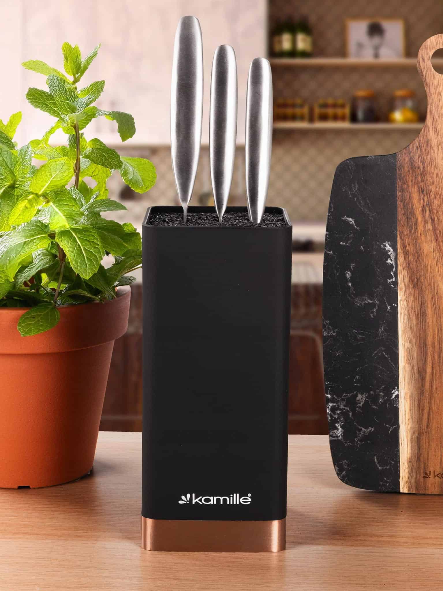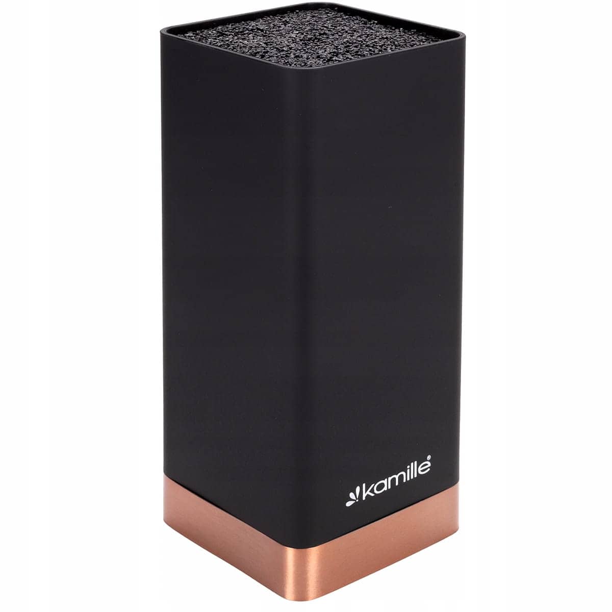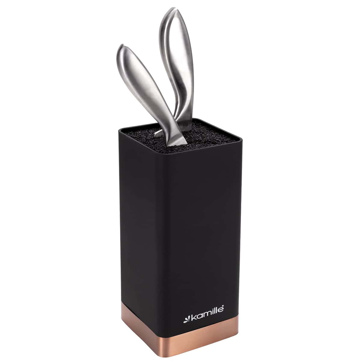 Suport cutite universal, design patrat modern, inaltime 22 cm. Sistemul interior de fibre de plastic asigura o depozitare sigura si igienica a cutitelor de orice dimensiune si forma.