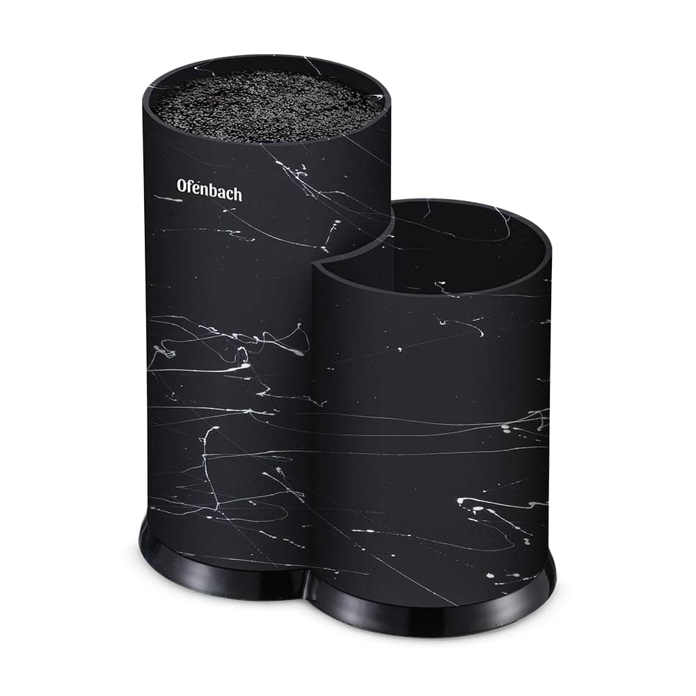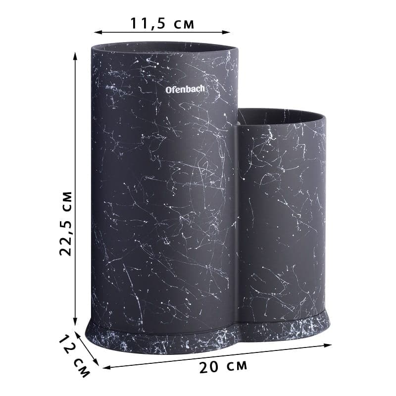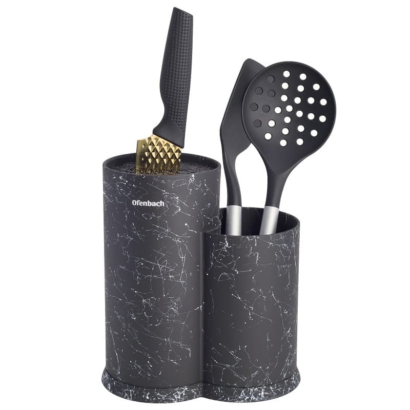 Acest organizator inteligent ofera solutia de depozitare 2-in-1, combinand un bloc universal de cutite cu un compartiment separat pentru ustensilele de gatit (polonice, spatule etc.). Inaltimea de 22 cm asigura sustinerea majoritatii lamelor si ustensilelor.