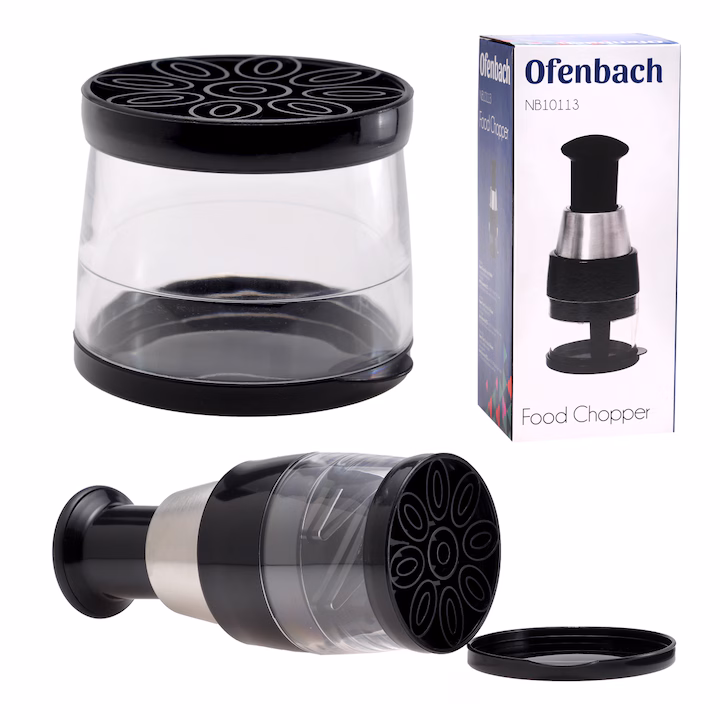 Tăietorul Ofenbach este construit din oțel inoxidabil, ceea ce îi conferă rezistență și durată lungă de viață. Capacitatea superioară este realizată din plastic alimentar, ușor și sigur pentru legume, menținând igiena și integritatea produselor.